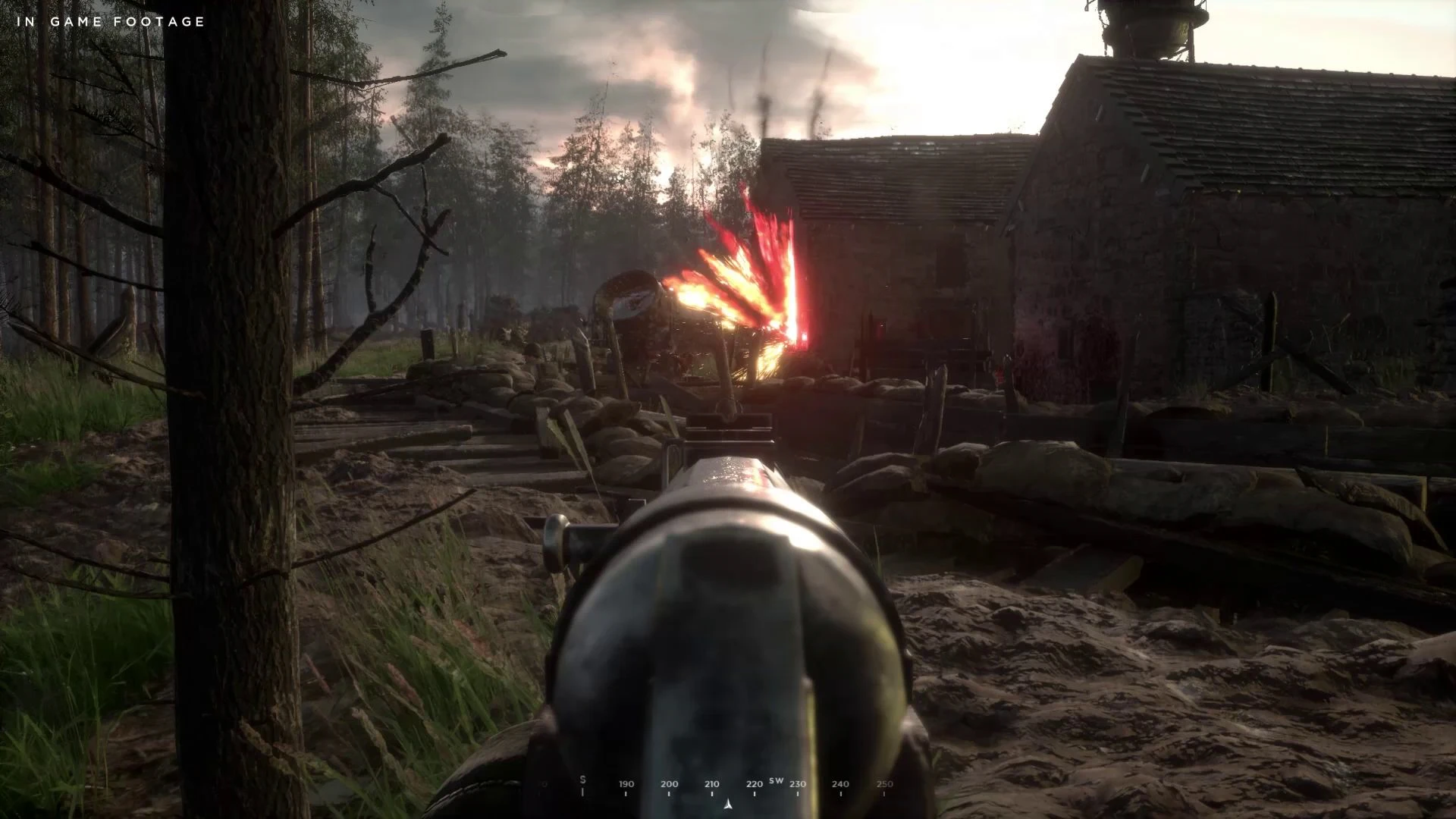 Разрушения меняют ландшафт — дома рушатся, деревья падают, поля превращаются в грязь.